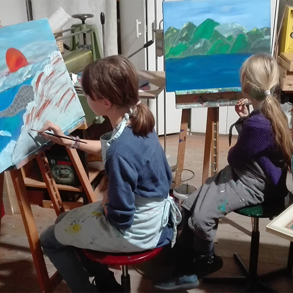 Die Kreativkurse im freien Atelier stehen im Geist der Schule der Phantasie. Kinder haben hier die Möglichkeit, ihren spontanen künstlerischen Impulsen zu folgen und mit unterschiedlichen Techniken und Materialien zu experimentieren, dabei aber auch ausgewählte Themen zu erarbeiten. Die individuelle Förderung und der Spaß im Umgang mit Farben und Materialien stehen dabei im Vordergrund.